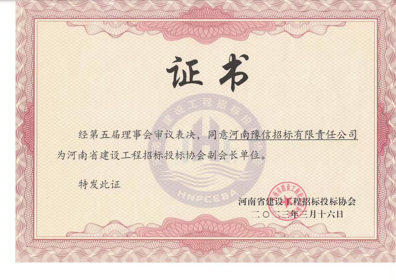 經(jīng)第五屆理事會審議表決,同意河南豫信招標有限責任公司為河南省建設(shè)工程招標投標協(xié)會副會長單位。 -