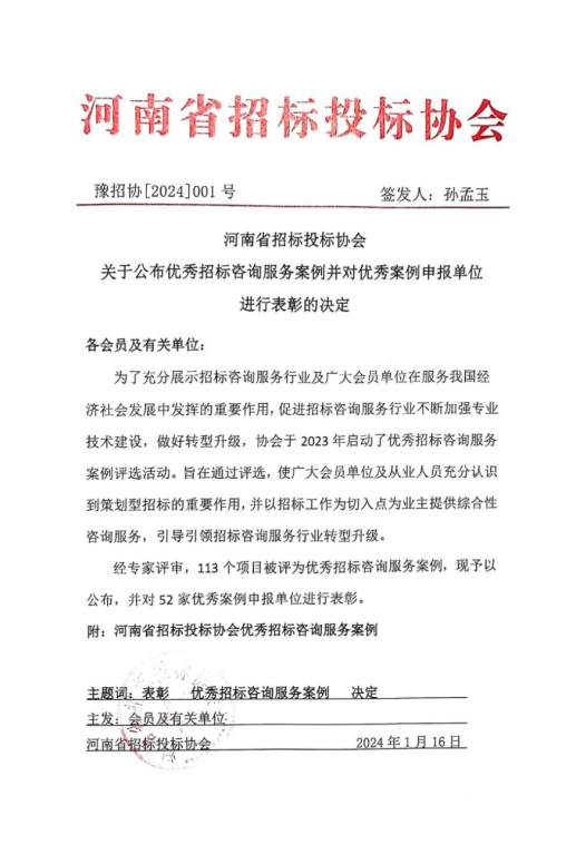 ?? ? 1 月 16 日,河南省招標(biāo)投標(biāo)協(xié)會(huì)公布了優(yōu)秀招標(biāo)咨詢服務(wù)案例并對(duì)優(yōu)秀案例申報(bào)單位進(jìn)行表彰。河南豫信招標(biāo)有限責(zé)任公司申報(bào)的開(kāi)封綜合報(bào)稅區(qū)建設(shè)項(xiàng)目全過(guò)程工程咨詢、鄭州中滎城市更新有限公司滎陽(yáng)市 “ 鄭上文脈活力帶 ” 城市更新項(xiàng)目鄭上路道路改造提升及 15 分鐘生活圈工程、信陽(yáng)市出山店供水工程項(xiàng)目 EPC 總承包、河南林州弓上抽水蓄能電站施工供水工程項(xiàng)目、河南省大數(shù)據(jù)管理局一體化協(xié)同辦公平臺(tái)項(xiàng)目,被評(píng)為優(yōu)秀招標(biāo)咨詢服務(wù)案例。