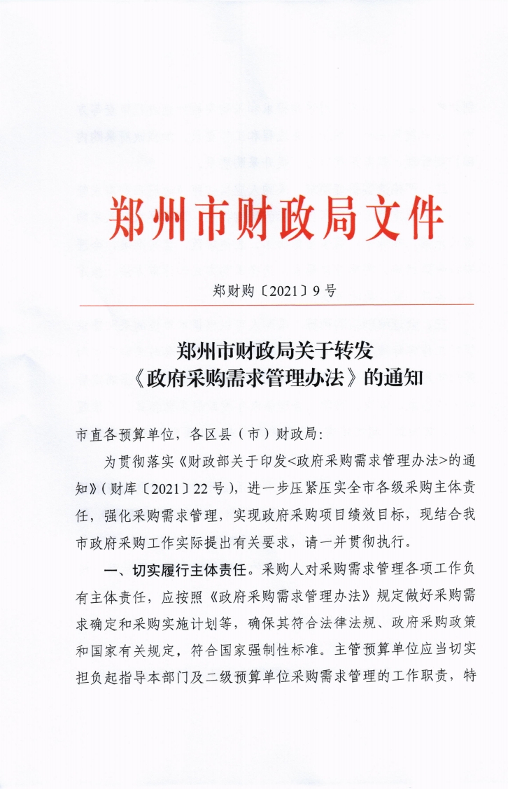 鄭州市財(cái)政局 關(guān)于轉(zhuǎn)發(fā)《政府采購需求管理辦法》的通知