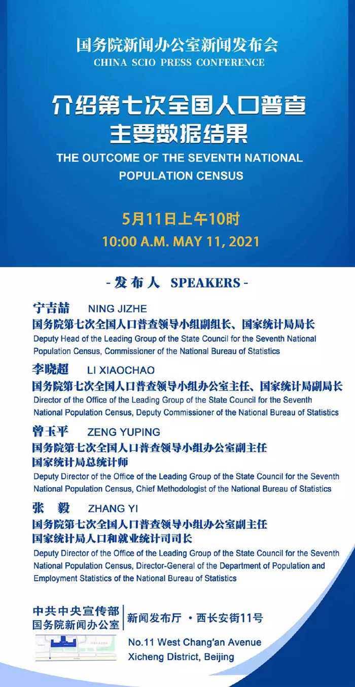 國務(wù)院新聞辦公室定于2021年5月11日上午10時舉行新聞發(fā)布會,請國務(wù)院第七次全國人口普查領(lǐng)導(dǎo)小組副組長、國家統(tǒng)計局局長寧吉喆,國務(wù)院第七次全國人口普查領(lǐng)導(dǎo)小組辦公室主任、國家統(tǒng)計局副局長李曉超,國務(wù)院第七次全國人口普查領(lǐng)導(dǎo)小組辦公室副主任、國家統(tǒng)計局總統(tǒng)計師曾玉平,國務(wù)院第七次全國人口普查領(lǐng)導(dǎo)小組辦公室副主任、國家統(tǒng)計局人口和就業(yè)統(tǒng)計司司長張毅介紹第七次全國人口普查主要數(shù)據(jù)結(jié)果,并答記者問。