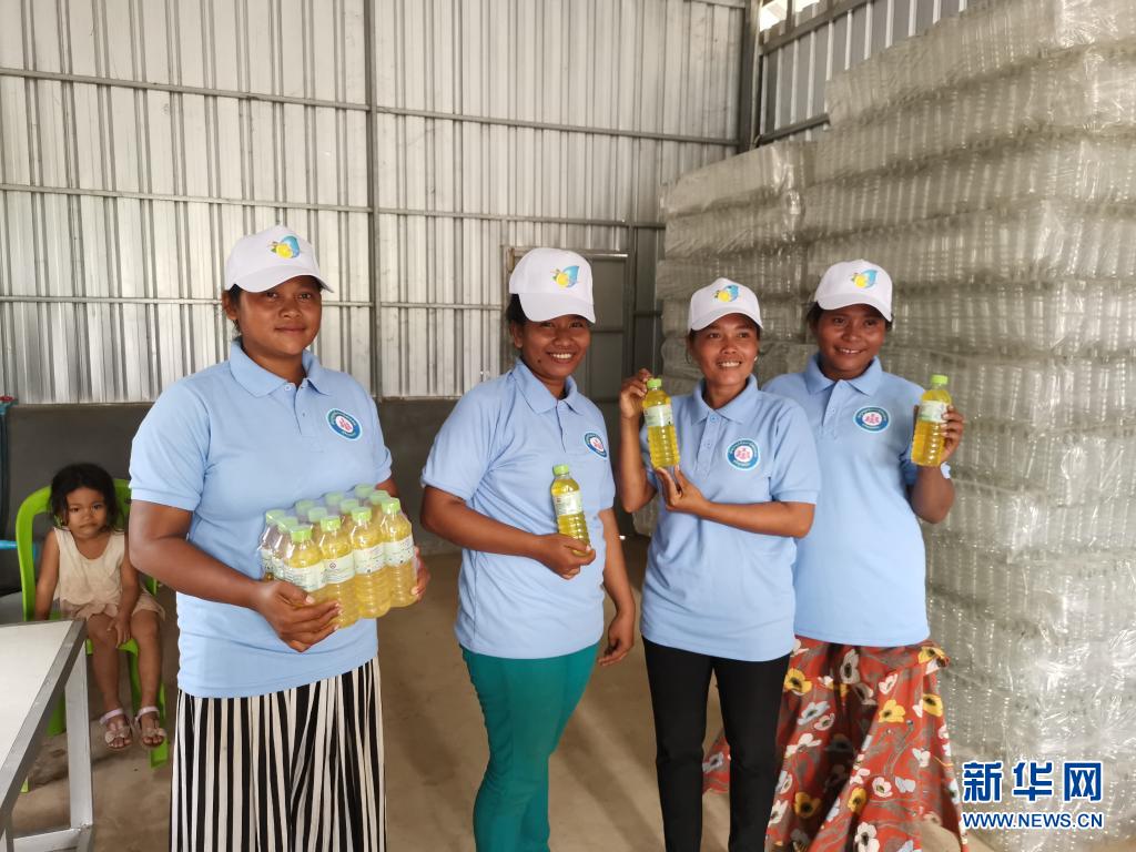 2020年7月31日,村民在柬埔寨干丹省莫穆坎普縣斯瓦安普鄉(xiāng)的洗潔精加工廠展示生產(chǎn)的洗潔精。新華社發(fā)
