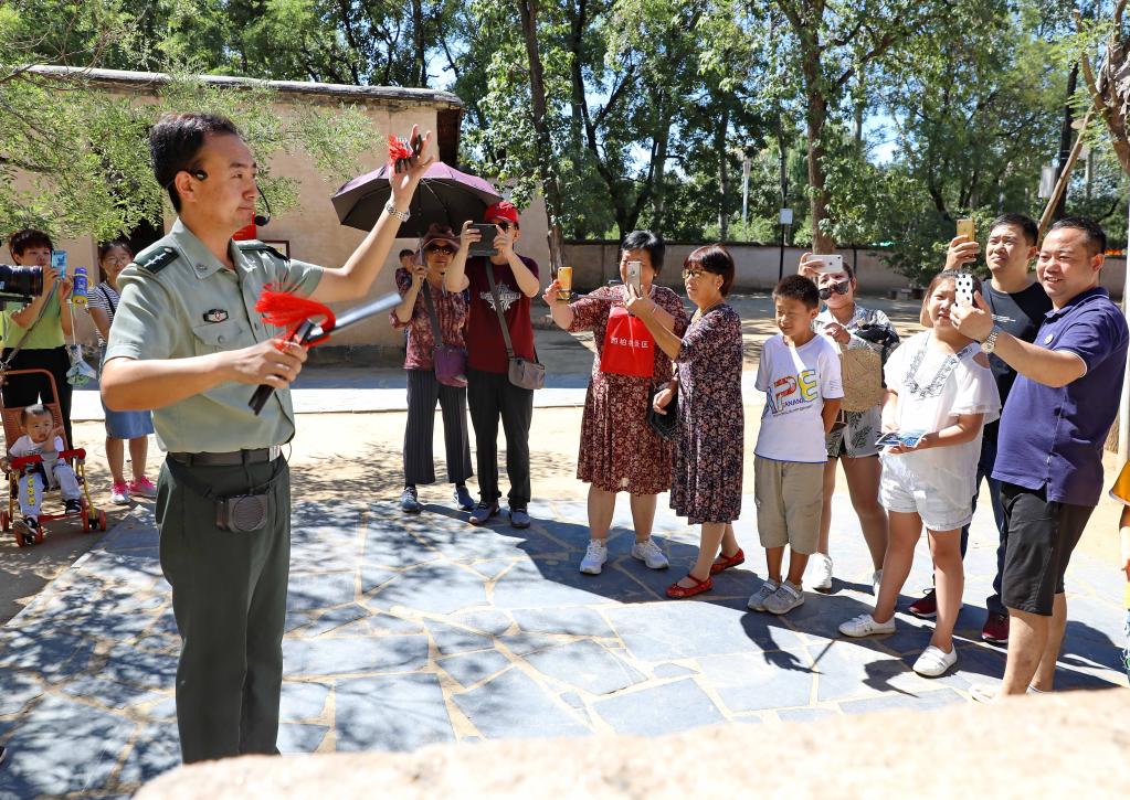 在西柏坡舊址,講解員韓向飛為游客進行講解(2019830日攝)。新華社記者楊世堯攝