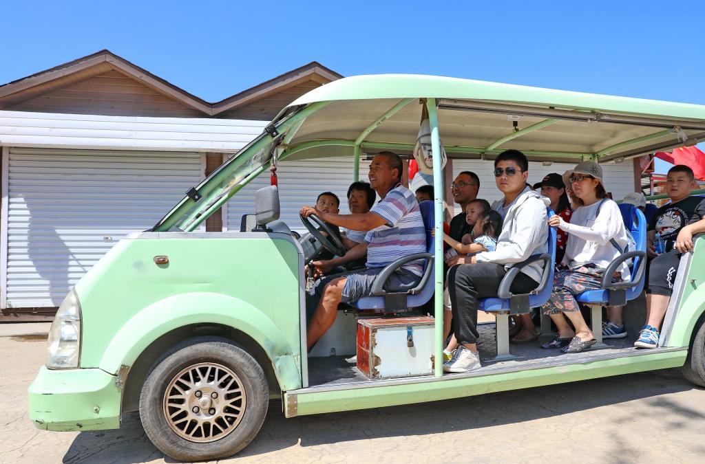 在西柏坡,村民駕駛電動車帶領(lǐng)乘客觀光游覽(2019816日攝)。新華社記者楊世堯攝