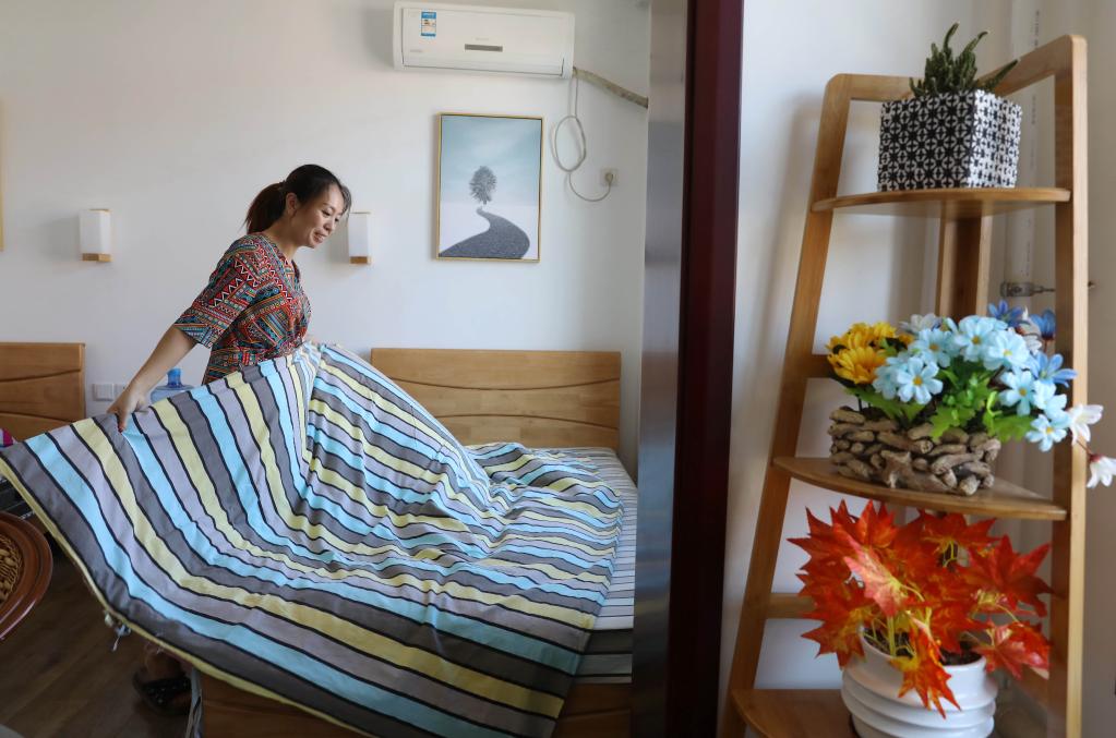 西柏坡鎮(zhèn)梁家溝村村民在民宿內(nèi)整理客房(2019816日攝)。新華社發(fā)