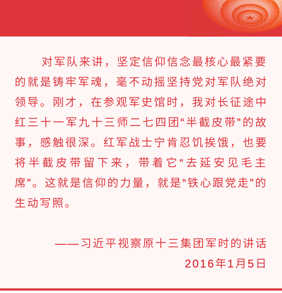 2016年1月5日,習(xí)主席視察原13集團(tuán)軍,當(dāng)聽到“半截皮帶”的故事時(shí),習(xí)主席深有感觸地說(shuō):“這就是信仰的力量,就是‘鐵心跟黨走’的生動(dòng)寫照。”
