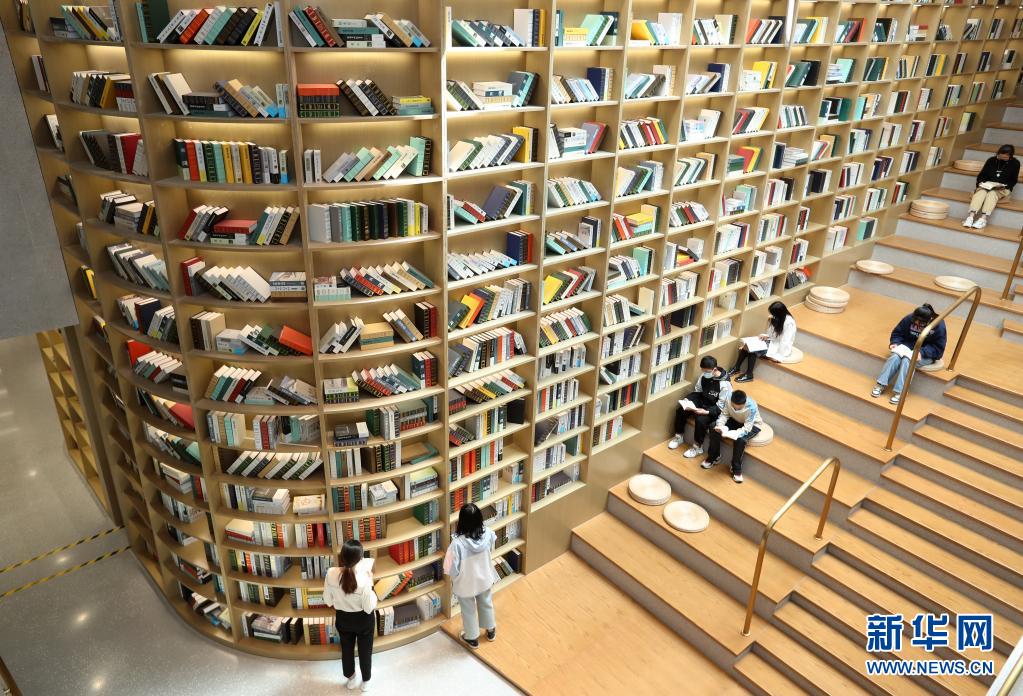 2021年5月2日,讀者在安徽省蒙城縣圖書館天梯書架旁閱讀書籍。新華社發(fā)(胡衛(wèi)國(guó) 攝)