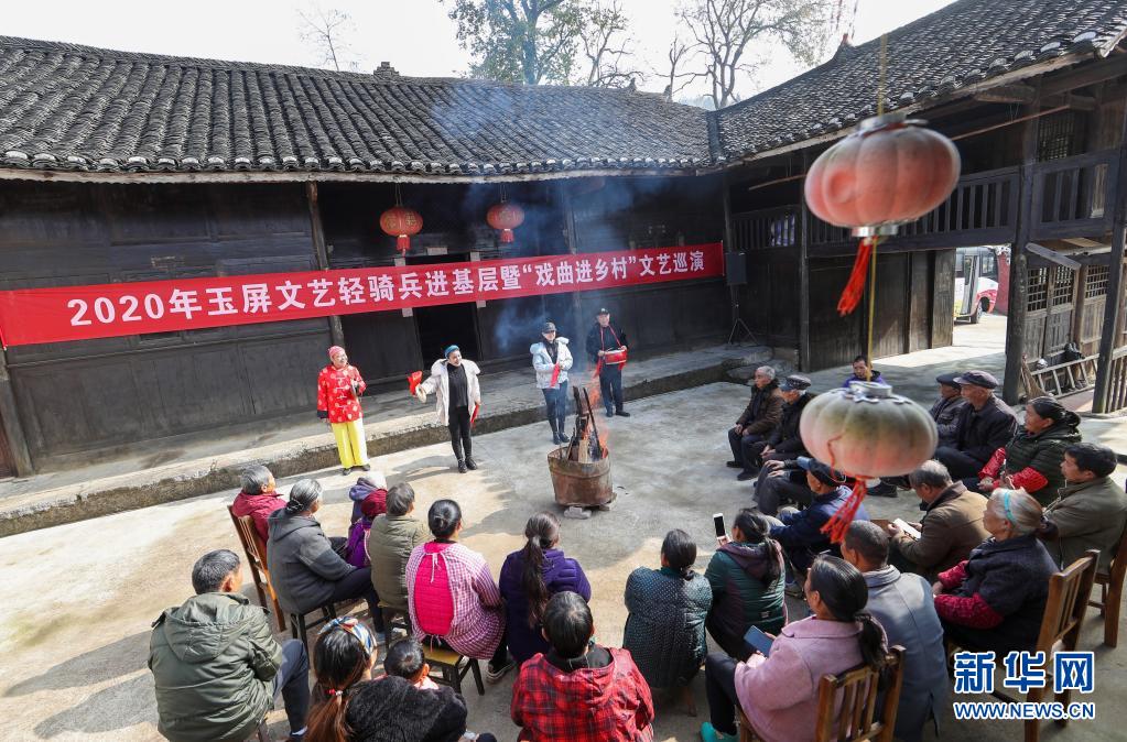 2020年11月30日,在貴州省銅仁市玉屏侗族自治縣新店鎮(zhèn)新店村農(nóng)家院壩,文化志愿者為村民表演小品。新華社發(fā)(胡攀學(xué) 攝)