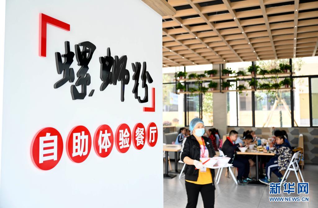 2021年4月29日,在廣西柳州螺螄粉產(chǎn)業(yè)園,參加研學(xué)團(tuán)的學(xué)生在一家螺螄粉企業(yè)里品嘗螺螄粉。新華社發(fā)(黎寒池 攝)