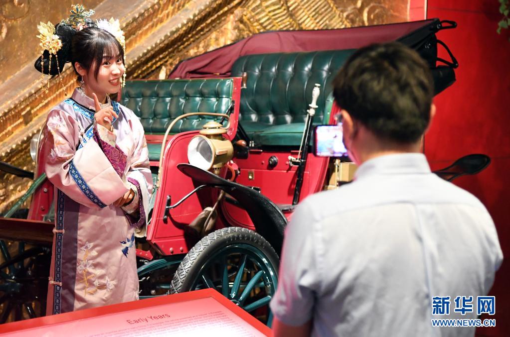2020年5月18日,在北京汽車博物館,曾紅娟(左)用講故事的方式通過網(wǎng)絡(luò)直播平臺(tái)為觀眾介紹藏品車。新華社記者 任超 攝