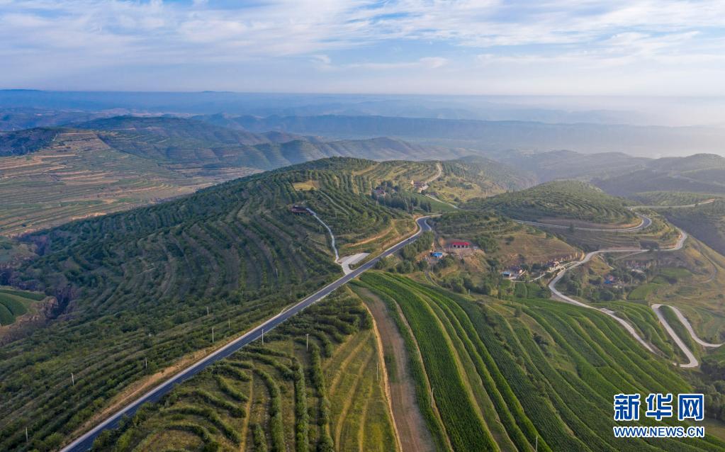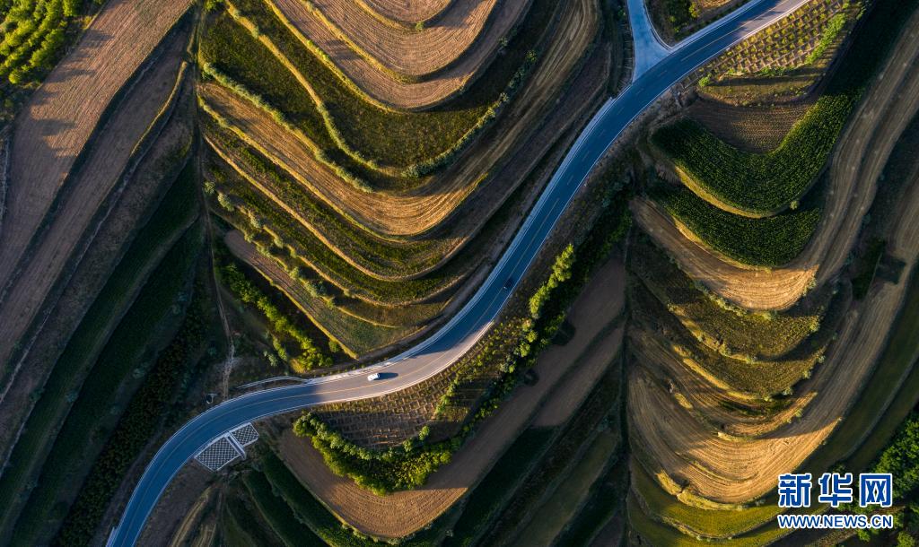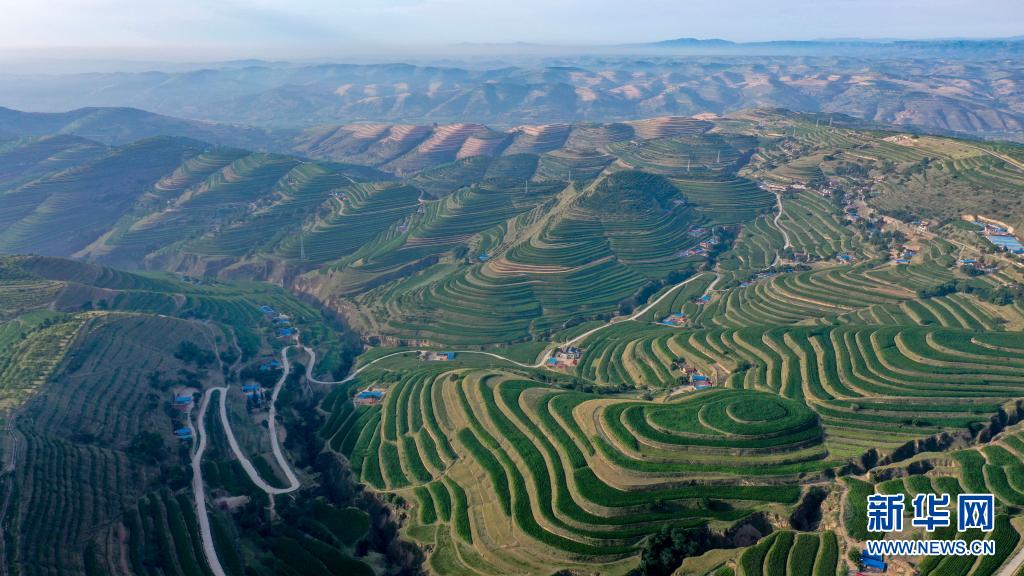 這是7月14日在寧夏固原市彭陽縣拍攝的青云灣旱作梯田公園(無人機照片)。新華社記者 馮開華 攝