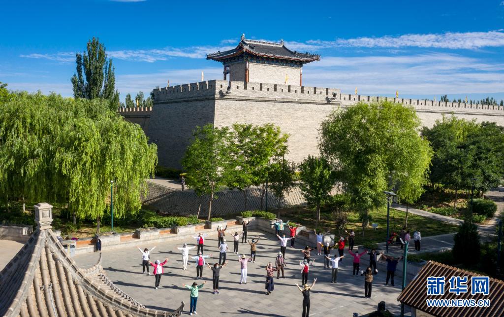 6月18日,寧夏鹽池縣居民在城墻腳下跳廣場舞(無人機照片)。新華社記者 馮開華 攝