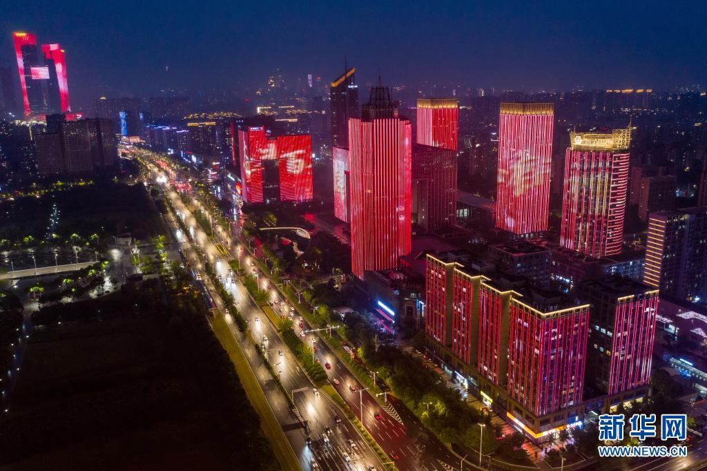 這是625日在南京市河西新城中軸線拍攝的慶祝建黨百年主題燈光秀(無人機照片)。新華社記者 李博 攝