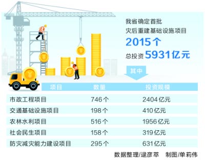 8月23日,記者從省發(fā)展改革委獲悉,我省確定首批災(zāi)后重建基礎(chǔ)設(shè)施項目2015個,總投資5931億元,涉及市政工程項目、交通基礎(chǔ)設(shè)施項目、農(nóng)林水利項目、社會民生項目、防災(zāi)減災(zāi)能力建設(shè)項目等多個領(lǐng)域。