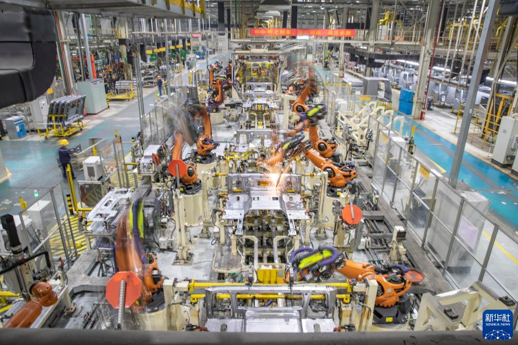4月2日,在重慶上汽依維柯紅巖商用車有限公司焊裝車間,機(jī)器人在進(jìn)行焊接作業(yè)。新華社記者 黃偉 攝