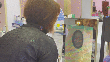 站在“魔鏡”前閉眼,“魔鏡”就會(huì)為測(cè)試者拍照。等待幾秒鐘后,它即可自動(dòng)分析出測(cè)試者皮膚年齡、狀態(tài),并精準(zhǔn)對(duì)接需求,個(gè)性化建議測(cè)試者適用的護(hù)膚品?!澳хR”旁,為緩解大眾脫發(fā)焦慮而設(shè)計(jì)的激光生發(fā)儀、生發(fā)帶十分引人關(guān)注,不時(shí)有參觀者試戴并咨詢采購事宜。