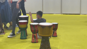 小朋友在服貿(mào)會(huì)現(xiàn)場(chǎng)體驗(yàn)擊鼓