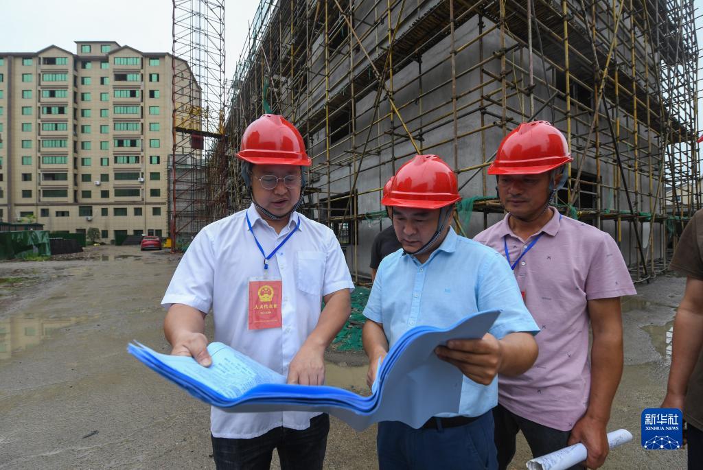 2021年6月2日,在浙江省湖州市吳興區(qū)東林鎮(zhèn)星火村,當?shù)厝舜蟠淼揉l(xiāng)村議事會成員對星火村農(nóng)民新村建設項目的施工進展情況進行監(jiān)督檢查。新華社記者 徐昱 攝