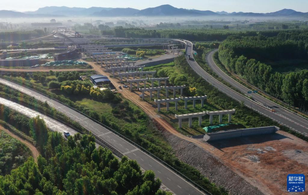 這是6月6日在遵化市境內(nèi)拍攝的京秦高速公路遵(遵化)秦(秦皇島)段與唐(唐山)承(承德)高速下院寺樞紐互通建設工地(無人機照片)。新華社記者 楊世堯 攝