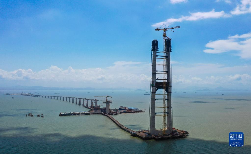 由中交二航局承建的深中通道伶仃洋大橋東索塔(7月1日攝)。新華社記者 劉大偉 攝