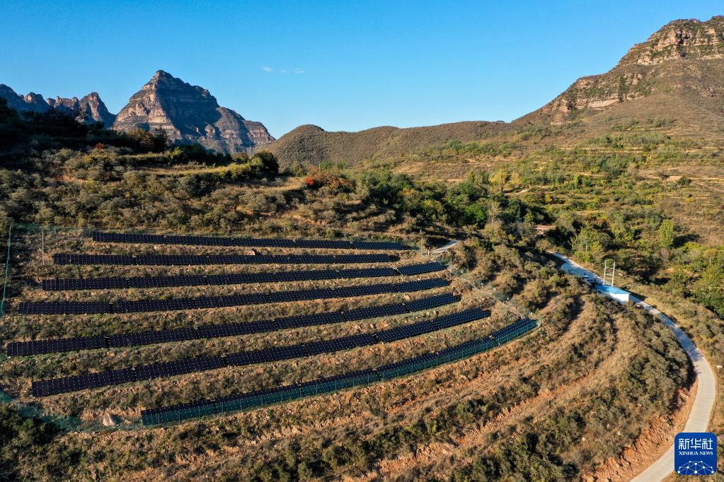 這是2020年10月16日在山西省左權(quán)縣拍攝的一處村級(jí)光伏電站(無人機(jī)照片)。新華社記者 曹陽 攝