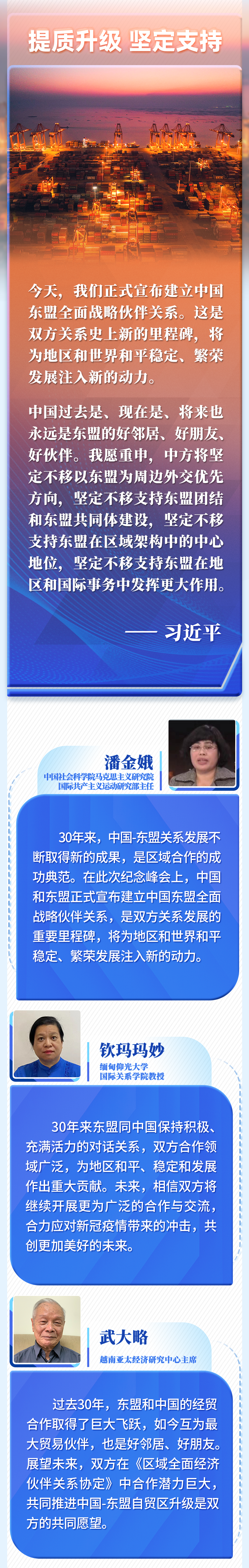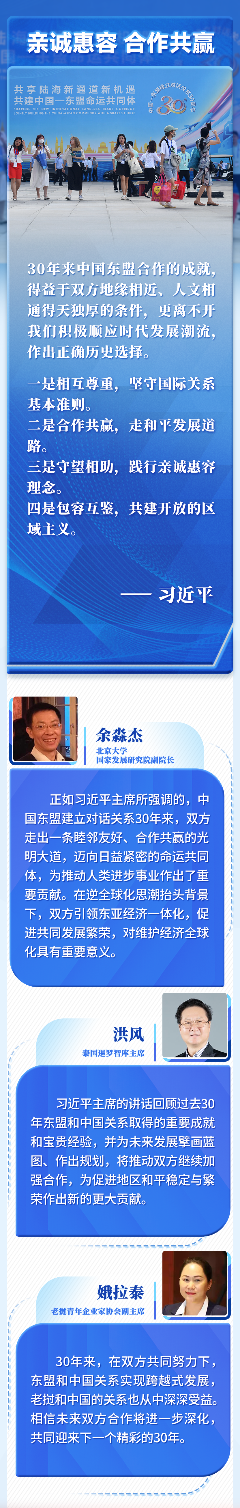 30年的寶貴經(jīng)驗(yàn)是中國和東盟的共同財(cái)富,為雙方發(fā)展全面戰(zhàn)略伙伴關(guān)系奠定了基礎(chǔ)、提供了遵循。我們要倍加珍惜、長久堅(jiān)持,并在新的實(shí)踐中不斷豐富和發(fā)展。