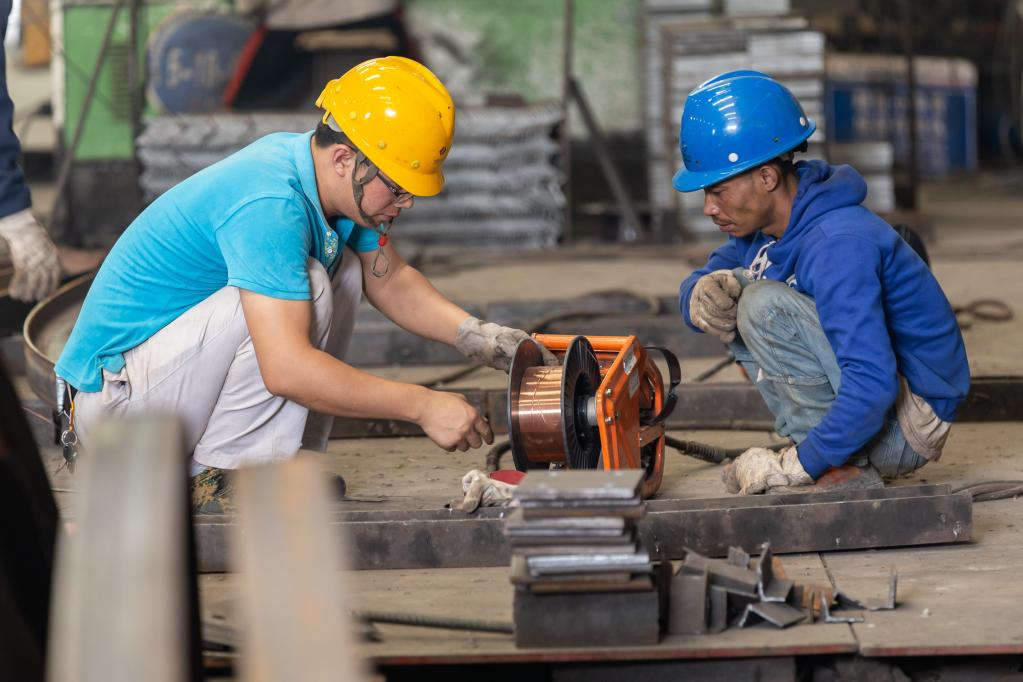 2019年11月7日,在老撾瑯勃拉邦,中國(guó)技術(shù)人員(左)在鋼筋加工廠教老撾工人檢修設(shè)備。