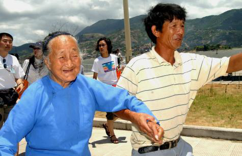2003年7月22日,在馬祖探親的福建省連江縣83歲的張水金老人(左)和兒子(右)乘坐“閩珠二號(hào)”海上直航客輪回到福州馬尾。新華社記者 張國(guó)俊 攝