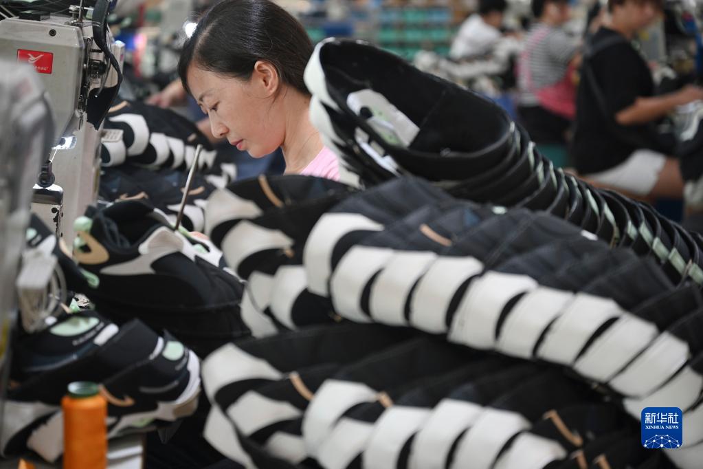 在位于福建省泉州市的鴻星爾克集團(tuán)鴻榮輕工公司車間,工人在制鞋生產(chǎn)線上作業(yè)(7月30日攝)。泉州市是我國(guó)重要的制造業(yè)基地,民營(yíng)企業(yè)較多。新華社記者 宋為偉 攝