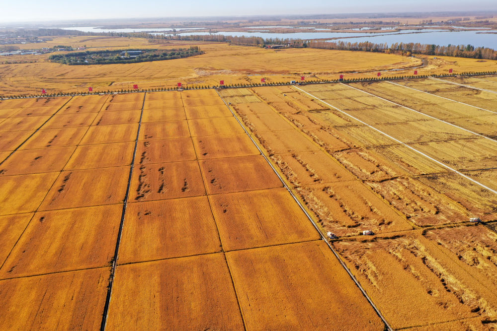 在吉林省吉林市永吉縣萬昌鎮(zhèn),農(nóng)民駕駛農(nóng)機(jī)收割水稻(2021年10月12日攝,無人機(jī)照片)。新華社記者 張楠 攝