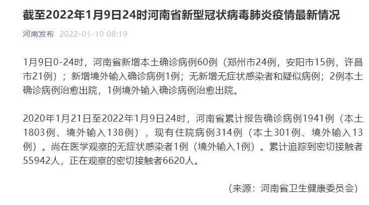 1月9日0-24時,河南省新增本土確診病例60例(鄭州市24例,安陽市15例,許昌市21例);新增境外輸入確診病例1例;無新增無癥狀感染者和疑似病例;2例本土確診病例治愈出院,1例境外輸入確診病例治愈出院。
