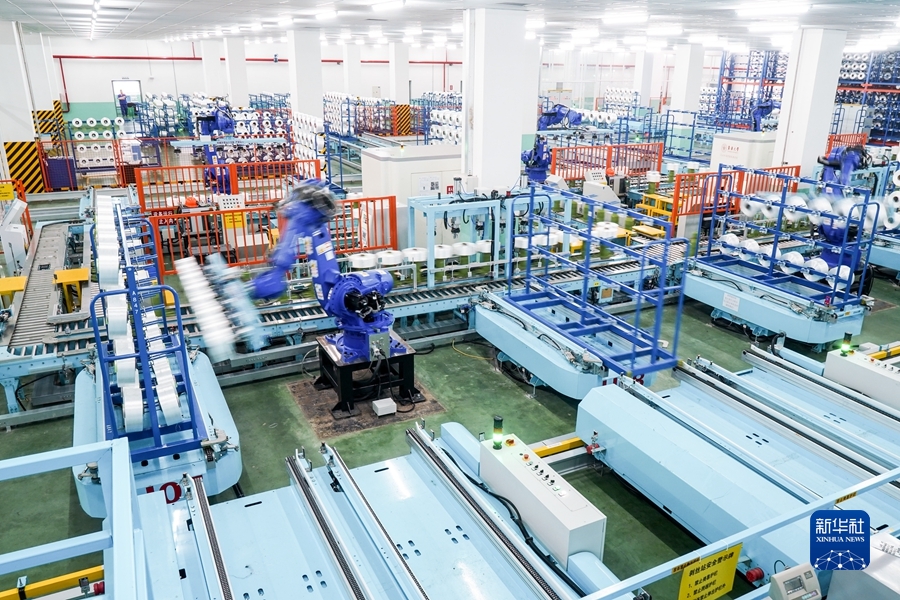 2021年5月14日,在位于江蘇省蘇州市吳江區(qū)盛澤鎮(zhèn)的一家智能車間,機器人在車間內自動作業(yè)。新華社記者 李博 攝
