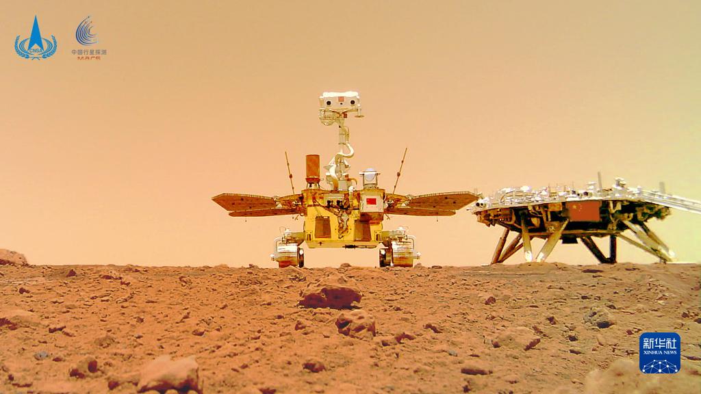 這是“著巡合影”圖。2021年6月11日,國(guó)家航天局在北京舉行天問(wèn)一號(hào)探測(cè)器著陸火星首批科學(xué)影像圖揭幕儀式,公布了由祝融號(hào)火星車(chē)拍攝的著陸點(diǎn)全景、火星地形地貌、“中國(guó)印跡”和“著巡合影”等影像圖。首批科學(xué)影像圖的發(fā)布,標(biāo)志著我國(guó)首次火星探測(cè)任務(wù)取得圓滿(mǎn)成功。新華社發(fā)(國(guó)家航天局供圖)