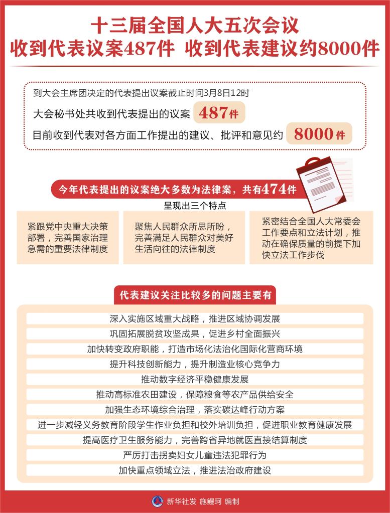 新華社北京3月9日電 記者9日從十三屆全國人大五次會議秘書處獲悉,到大會主席團決定的代表提出議案截止時間3月8日12時,大會秘書處共收到代表提出的議案487件。此外,目前收到代表對各方面工作提出的建議、批評和意見約8000件。