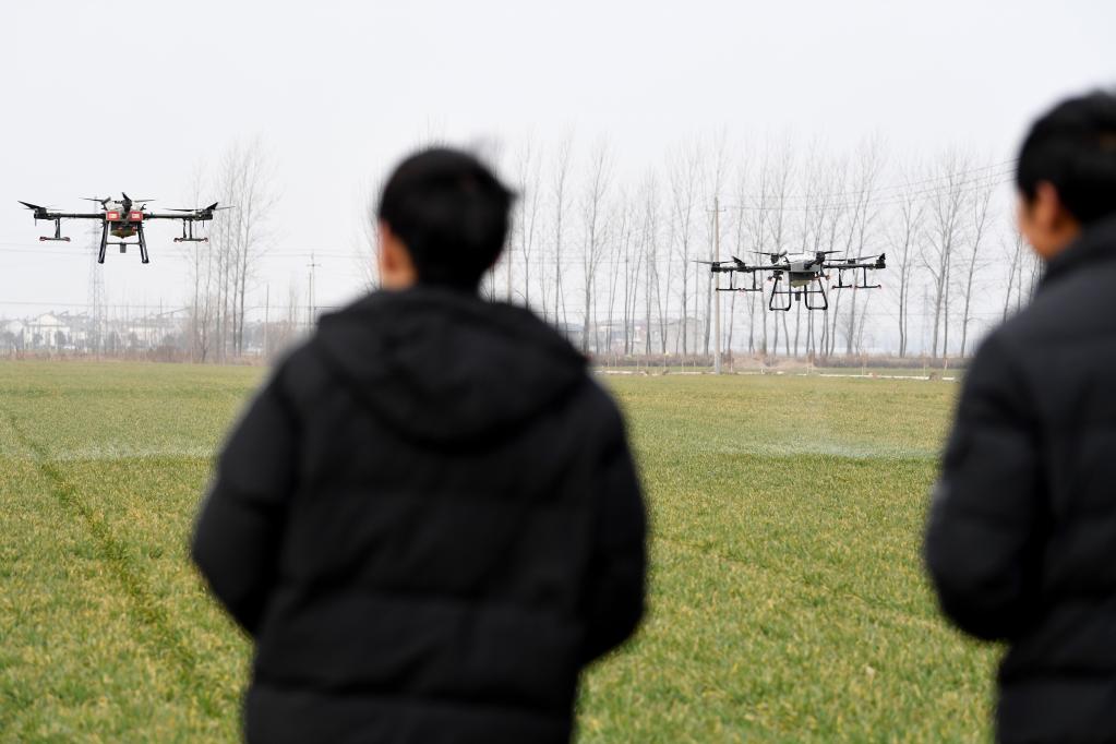 2月11日,亳州市譙城區(qū)趙橋鄉(xiāng)“無人農(nóng)場”無人機在噴灑除草劑。新華社記者劉軍喜攝