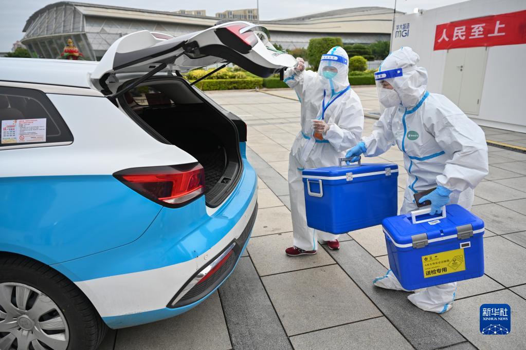 3月24日,在福建泉州市海峽體育中心聯(lián)合方艙核酸檢測基地,參加“抗疫志愿車隊”的出租車司機(jī)(左)協(xié)助醫(yī)務(wù)人員裝運核酸檢測樣本。新華社發(fā)(周義攝)