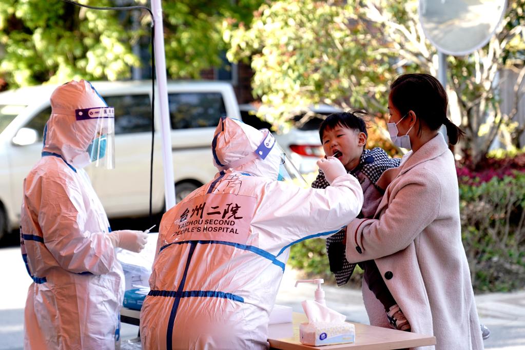 4月4日,在上海松江區(qū)祥欣居民區(qū),浙江援滬醫(yī)療隊(duì)隊(duì)員為小朋友進(jìn)行核酸檢測(cè)采樣。新華社記者 張建松 攝