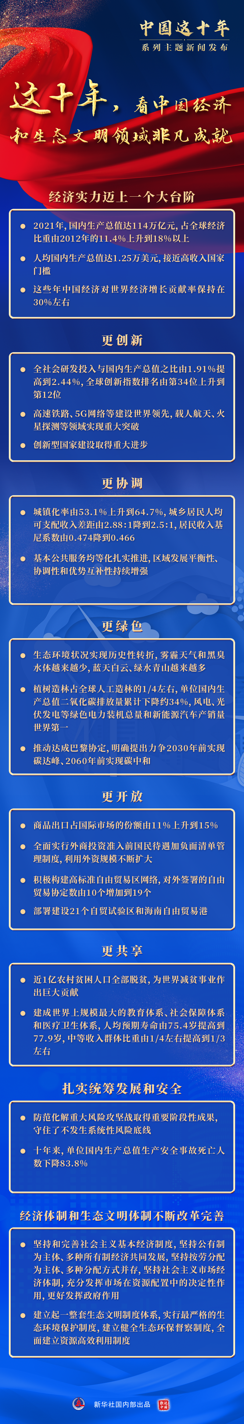這是我國(guó)經(jīng)濟(jì)實(shí)力又邁上一個(gè)大臺(tái)階的十年,這是扎實(shí)推進(jìn)創(chuàng)新發(fā)展、協(xié)調(diào)發(fā)展、綠色發(fā)展、開放發(fā)展、共享發(fā)展的十年,這是扎實(shí)統(tǒng)籌發(fā)展和安全的十年,這是經(jīng)濟(jì)體制和生態(tài)文明體制不斷改革完善的十年……