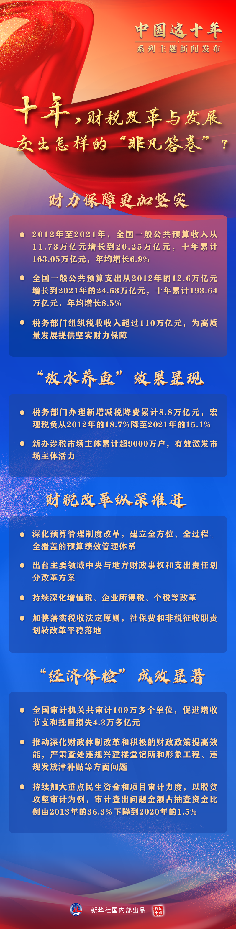 深化預(yù)算管理制度改革,建立全方位、全過程、全覆蓋的預(yù)算績(jī)效管理體系;出臺(tái)主要領(lǐng)域中央與地方財(cái)政事權(quán)和支出責(zé)任劃分改革方案;持續(xù)深化增值稅和企業(yè)所得稅改革,初步建立綜合與分類相結(jié)合的個(gè)人所得稅制度;強(qiáng)化財(cái)會(huì)監(jiān)督,嚴(yán)格財(cái)經(jīng)紀(jì)律……十年來,財(cái)稅體制改革縱深推進(jìn)。
