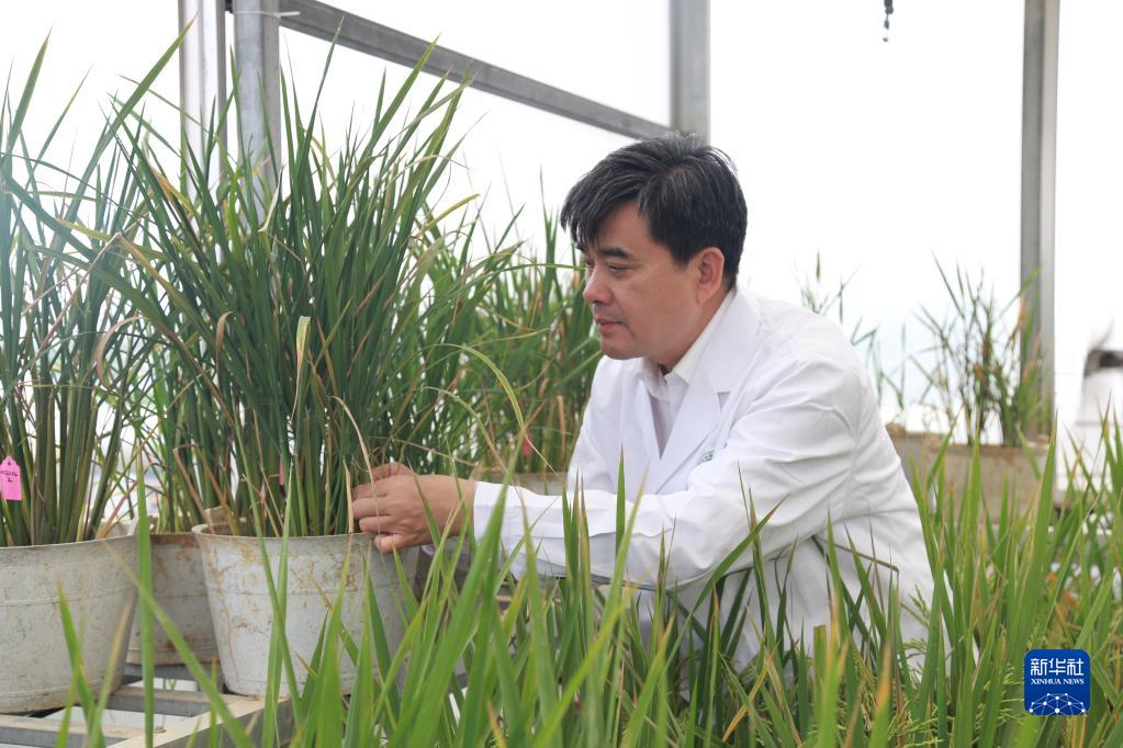 中國工程院院士、湖南省農(nóng)業(yè)科學(xué)院黨委書記柏連陽在實驗室查看水稻生長情況(資料照片)。新華社發(fā)(受訪者供圖)
