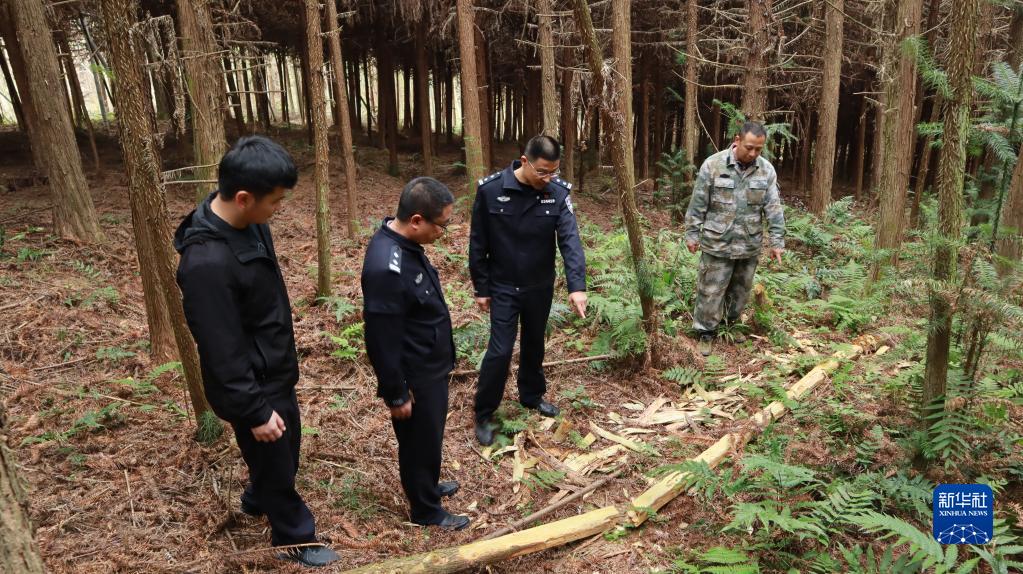 福建省南平市浦城縣公安局石陂森林派出所所長郭曉強(右二)在盜伐林木案件現(xiàn)場分析作案動機(2020年12月11日攝)。新華社記者 趙雪彤 攝
