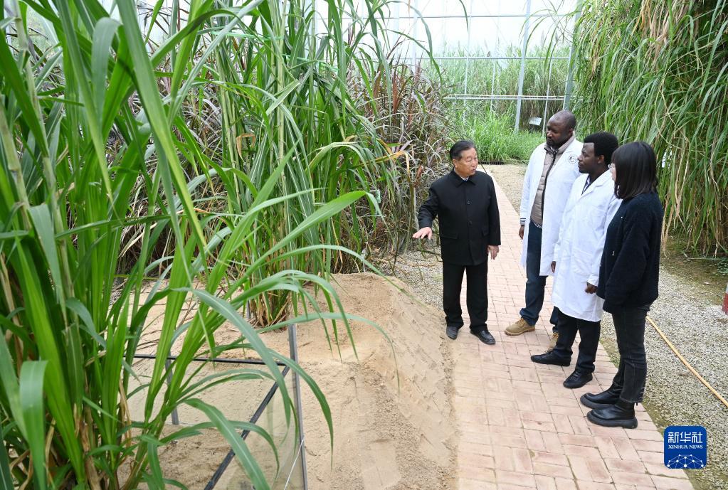 2021年11月23日,福建農(nóng)林大學(xué)菌草專家林占熺(左一)在國(guó)家菌草工程技術(shù)研究中心菌草種質(zhì)資源圃給外國(guó)留學(xué)生(左二、左三)講解菌草的種植培育技術(shù)。新華社記者 林善傳 攝