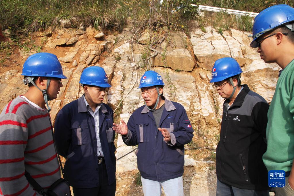 天文學(xué)家南仁東(中)與工程技術(shù)人員在大窩凼施工現(xiàn)場(chǎng)檢查施工進(jìn)展(2014年12月1日攝)。新華社發(fā)(中科院國(guó)家天文臺(tái)供圖)