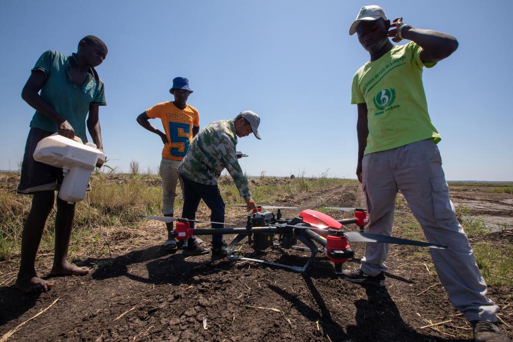 2019年11月28日,在莫桑比克的萬寶莫桑農(nóng)業(yè)園,中國農(nóng)業(yè)專家(右二)指導(dǎo)當(dāng)?shù)毓と耸褂脽o人機噴灑除草劑。新華社記者 張宇 攝