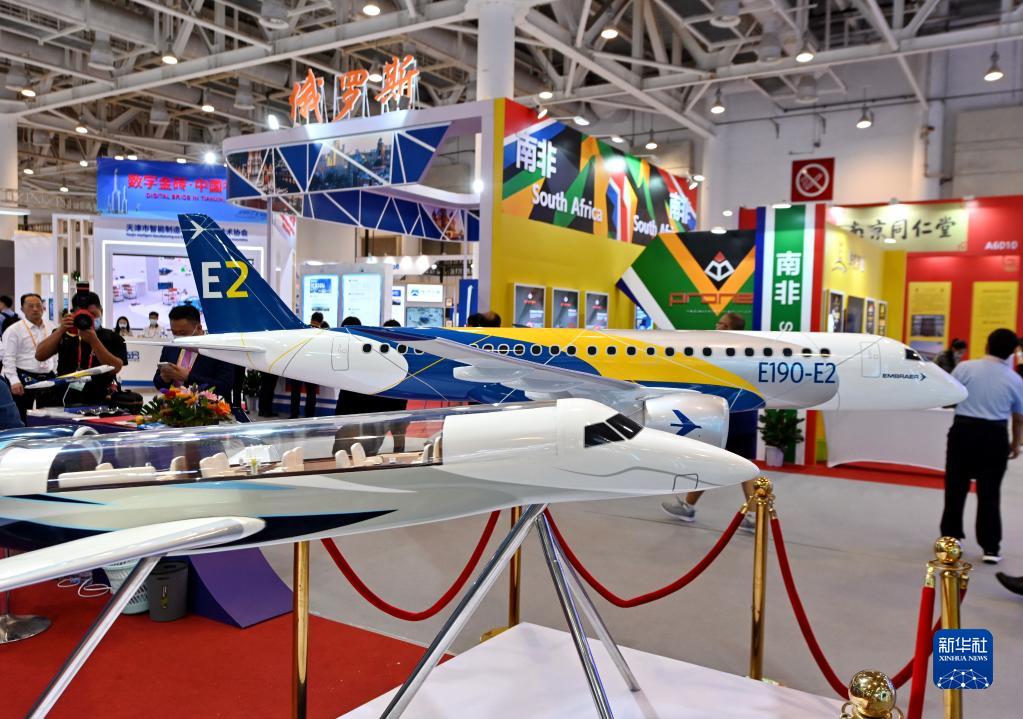 參觀者從2021金磚國家新工業(yè)革命展展出的飛機(jī)模型前走過(2021年9月8日攝)。新華社記者 林善傳 攝