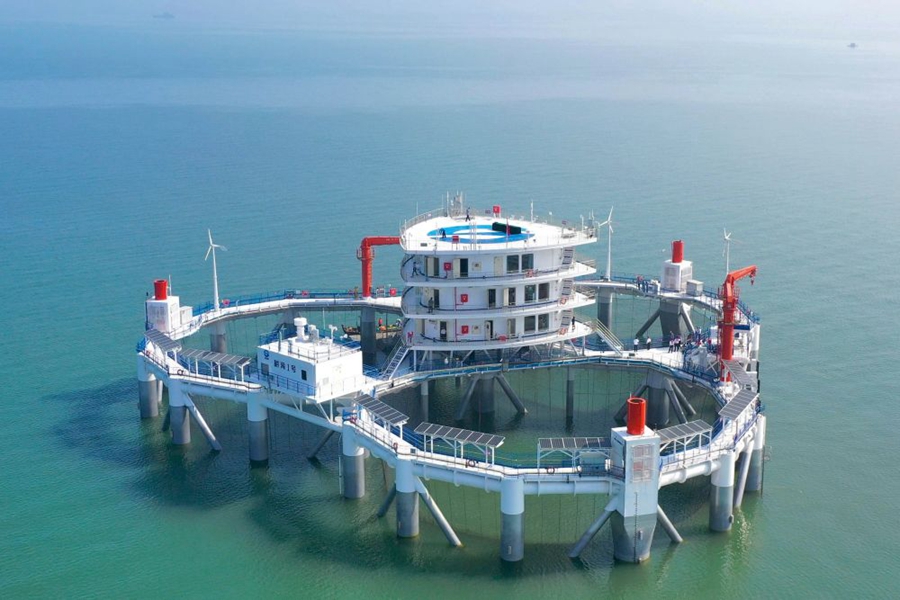 ↑“耕海1號”海洋牧場綜合體平臺位于山東省煙臺市漁人碼頭以東海域,是我國首座大型智能化海洋牧場綜合體平臺,于2020年7月投運,每年可養(yǎng)殖優(yōu)質(zhì)海水魚類20萬尾,年產(chǎn)量約15萬公斤(2020年7月10日攝)。