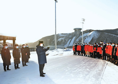 在國(guó)家冬季兩項(xiàng)中心看臺(tái),習(xí)近平觀看了冬季兩項(xiàng)越野滑雪和射擊運(yùn)動(dòng)員接力訓(xùn)練情況,并看望慰問國(guó)家冬季兩項(xiàng)、跳臺(tái)滑雪隊(duì)運(yùn)動(dòng)員、教練員和張家口賽區(qū)運(yùn)行保障團(tuán)隊(duì)、建設(shè)者代表。習(xí)近平親切地對(duì)大家說,我這次來考察北京冬奧會(huì)、冬殘奧會(huì)籌辦情況,也是在牛年春節(jié)前來看望大家。大家都在為辦好一屆成功的冬奧盛會(huì)而努力,運(yùn)動(dòng)員在刻苦訓(xùn)練,建設(shè)單位和建設(shè)者、保障團(tuán)隊(duì)兢兢業(yè)業(yè),成功打造了一批世界一流的精品工程,大家的奮斗精神、奉獻(xiàn)精神令人感奮。習(xí)近平強(qiáng)調(diào),北京冬奧會(huì)、冬殘奧會(huì)所有場(chǎng)館建設(shè)提前一年完成,我國(guó)很多冰雪項(xiàng)目在兩年多時(shí)間里實(shí)現(xiàn)從無到有,有的項(xiàng)目達(dá)到了世界先進(jìn)水平,充分體現(xiàn)了黨的領(lǐng)導(dǎo)和舉國(guó)體制、集中力量辦大事的制度優(yōu)勢(shì)。