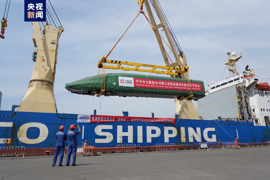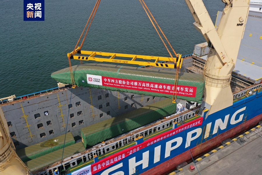 ? ?8月21日,我國(guó)出口印尼用于雅萬(wàn)高鐵的1組高速動(dòng)車(chē)組和1組綜合檢測(cè)列車(chē)在青島港順利完成裝船,通過(guò)海運(yùn)發(fā)往印尼。這是雅萬(wàn)高鐵首批發(fā)運(yùn)列車(chē),標(biāo)志著我國(guó)首次出口國(guó)外的高鐵列車(chē)正式啟運(yùn)。