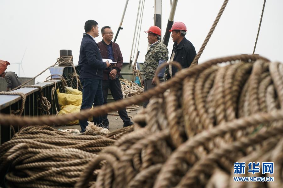 20201021日,江蘇省海安市濱海新區(qū)紀工委干部(左一、左二)向漁船負責人詢問惠漁油補發(fā)放情況。 新華社記者 季春鵬 攝
