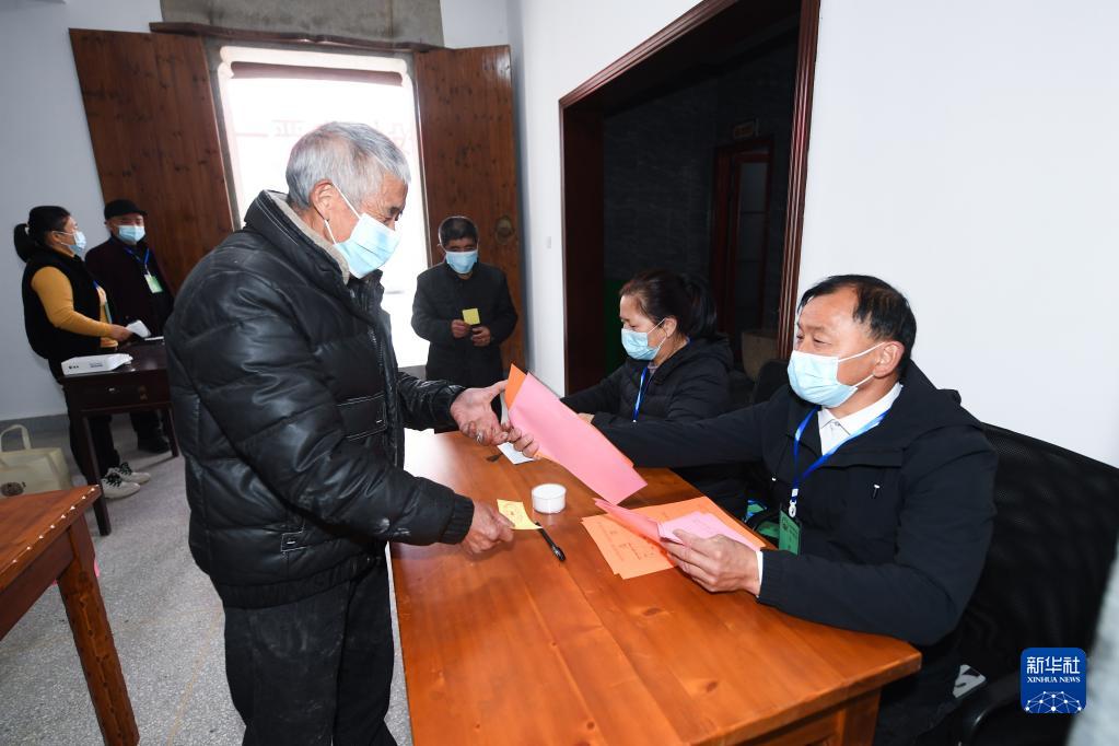 村民在浙江省杭州市臨安區(qū)湍口鎮(zhèn)迎豐村的基層投票點(diǎn)領(lǐng)取選票參加基層人大換屆選舉投票(2021年12月14日攝)。新華社記者 徐昱 攝