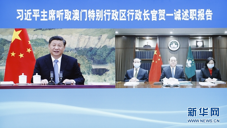 1月27日,國(guó)家主席習(xí)近平在北京以視頻連線(xiàn)方式聽(tīng)取了澳門(mén)特別行政區(qū)行政長(zhǎng)官賀一誠(chéng)2020年度的述職報(bào)告。新華社記者 劉彬 攝